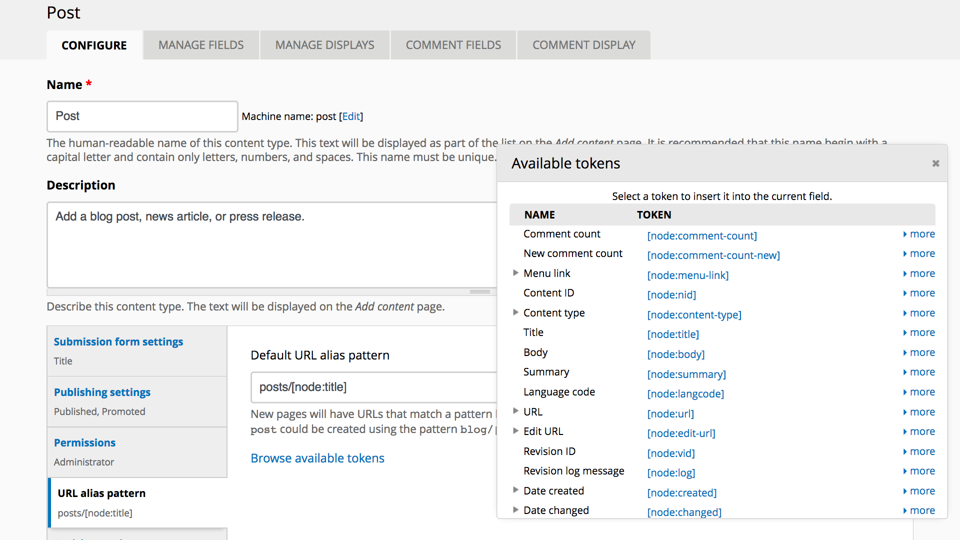 Konfiguration von Inhaltstypen (vgl. Pathauto)